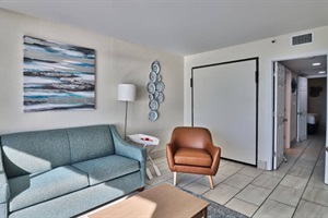 Accommodating up to 6 guests, the condo includes a bedroom with a king bed, a full-size Murphy bed, and a sleeper sofa. Room-darkening shades, bed linens, and extra pillows create a restful atmosphere, while Roku TVs in both the bedroom and living area provide simple entertainment for quiet evenings.