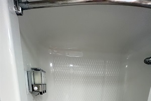 A clean, practical bathroom includes a bathtub, hot water, and bathroom essentials. Guests also have access to a shared outdoor shower within the property, convenient after time spent by the beach.