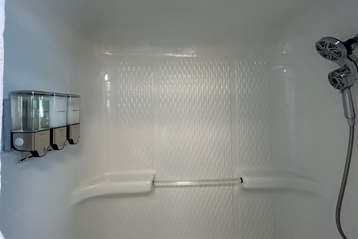 The bathroom includes a combination bathtub and shower, perfect for families. Essentials like shampoo, conditioner, body soap, and a hair dryer are provided, and an outdoor shower makes it easy to rinse off after the pool or sand.