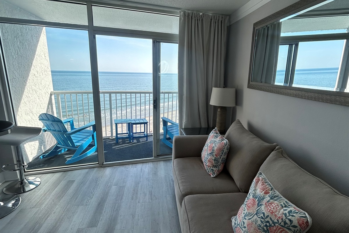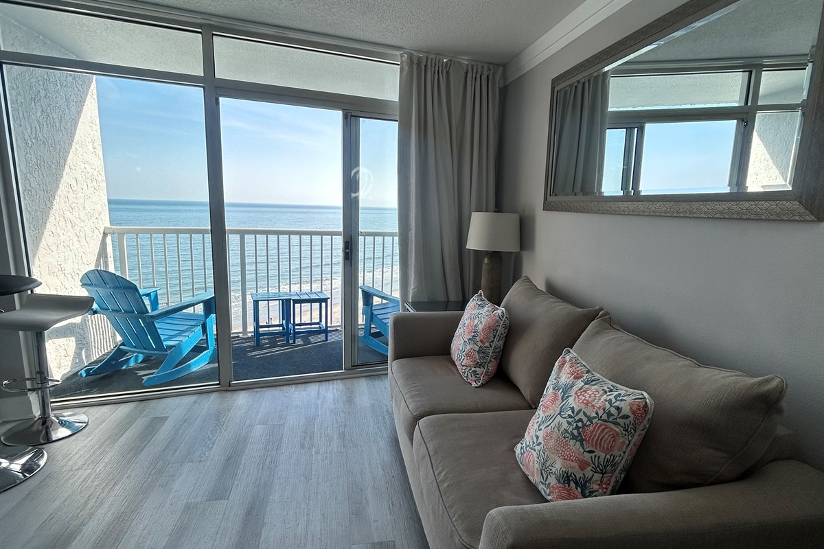 The sound of waves fills the air as you step inside this oceanfront condo at Seawatch Resort, where endless views of the Atlantic greet you from your private balcony. Feel the sea breeze drift through the space as you relax, unwind, and take in the rhythm of coastal life in Myrtle Beach’s northern end. Whether you’re watching dolphins glide by or savoring quiet evenings by the water, each moment feels grounded in the ocean’s calm.