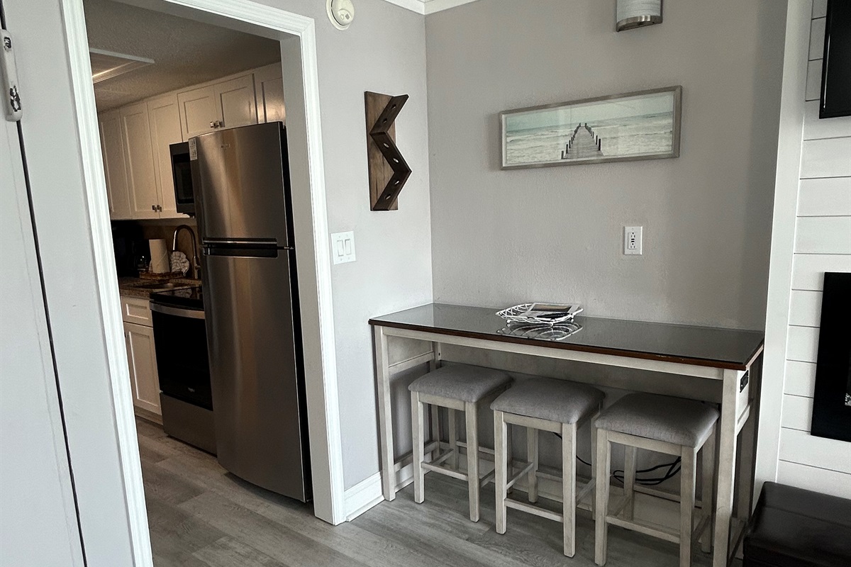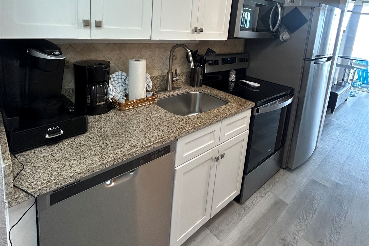 A full kitchen equipped with Whirlpool stainless steel appliances gives you the freedom to prepare your own meals. You’ll find a refrigerator, freezer, oven, stove, microwave, and dishwasher, along with a Keurig coffee maker, toaster, and wine glasses. A dining space invites you to gather for casual breakfasts before heading to the beach or relaxed dinners at day’s end.